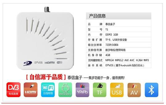 上圖是泰信基于下載CA技術(shù)開發(fā)的一款智能數(shù)字電視機(jī)頂盒。該機(jī)頂盒具有開放的接口規(guī)范,能夠運(yùn)行基于互聯(lián)網(wǎng)的下載CA,并得到了世界技術(shù)界的認(rèn)可。軟件開發(fā)者可以從泰信官網(wǎng)上獲取大量詳細(xì)的開發(fā)資料,機(jī)頂盒廠家可以從泰信獲取詳細(xì)的可直接生產(chǎn)的軟硬件技術(shù)資料。