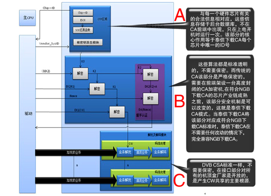 NGB下載CA的密鑰及派生算法均與加密機及前端CA服務器分離,即使有黑盒的NGB下載CA,黑盒保護的是與機頂盒有關的根密鑰,這個根密鑰與每一臺合法的芯片邦定,其作用與每一臺終端唯一的ID號等同,也與互聯網安全保護的CA證書作用類似,而用于CW加密的算法是標準和開放的,這個算法在終端中的使用頻次很低。因此,不論NGB下載CA還是泰信下載 CA,都不需要再像以往的CA那樣在前端機房設置一個高度封閉的用于加密CW的加密機可以不需要在運營商前端下載CA服務器設置黑盒。