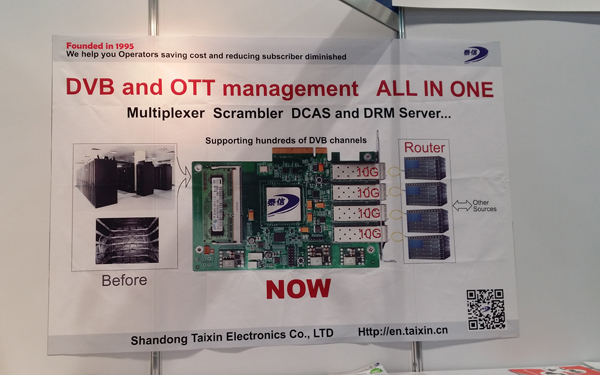 經過泰信展臺現場人員的講解,DVBCN記者了解到,這塊板卡配置了4個10G(萬兆)光口,可以處理高達40G的DVB或OTT音視頻流帶寬,集復用、加擾、下載CA及DRM管理于一身,只需與外部萬兆交換機連接,就可以處理數百個DVB信道,滿足4K超高清網絡及DVB電視對高碼流處理能力的需求,大幅度降低能源消耗和管理成本,是下一代DVB+OTT融合性前端設備的最佳選擇。