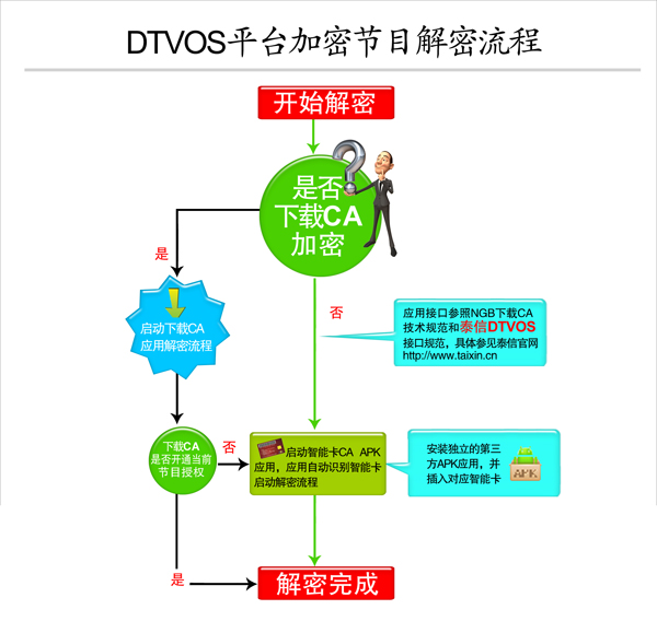 消除廣電機頂盒私有封閉的CA技術體系,可以促使廣電付費電視終端的智能化和市場化發展。廣電總局也為了達到此目的于2012年頒布了《NGB下載CA技術規范》,但因私有封閉成分消除的不徹底至今無法順利實施。而該規范中與硬件無關的Java接口為業界提供了參考,泰信電子參照該接口基于Android系統制訂了一套更加開放的適合廣電付費業務的接口規范,做到了付費電視業務的功能軟件與硬件的無關性。該規范一經向業界開放,就受到了國內外數字電視工程界的高度重視,經過近兩年的不斷完善,成為世界上唯一能夠參照的付費電視軟硬件分離接口規范,該接口定義了下載CA與付費電視基礎軟件之間的通訊接口,可以支持和運行所有付費電視加密系統,并得到了業界的廣泛認可,該接口可在泰信電子官網上免費下載。