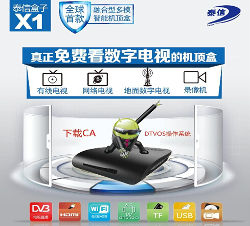 泰信盒子X1是國內首款多模智能機頂盒,集有線電視、網絡電視、免費地面數字電視三合一,還可一鍵錄制電視節目。此款盒子是市面上唯一一款基于安卓系統的地面數字電視盒,看數字電視永久免費!是一款適合家庭娛樂的功能最強大最人性化的智能高清機頂盒。