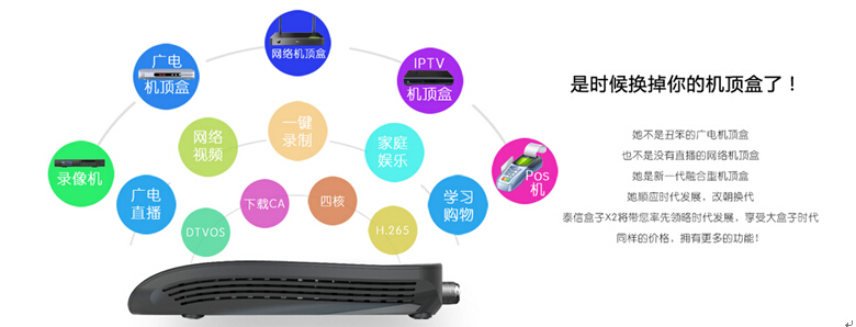 泰信盒子集有線電視、網絡電視、錄像機、游戲機等多功能于一體,多屏互動,無線共享,且全國通用。讓您看電視由被動變主動,真正做電視的主人。