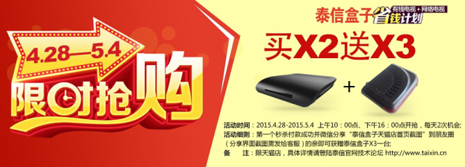 此次五一特惠,泰信電子特將被評為“2014年度十大最受喜愛的電視盒子”的泰信盒子X2,在泰信盒子官方天貓店進行限時搶購,買泰信盒子X2,贏免單新品!活動日期是4月28日至5月4日,活動規則請登錄泰信電子技術論壇查閱。同時,從泰信官網商城下單更有驚喜。