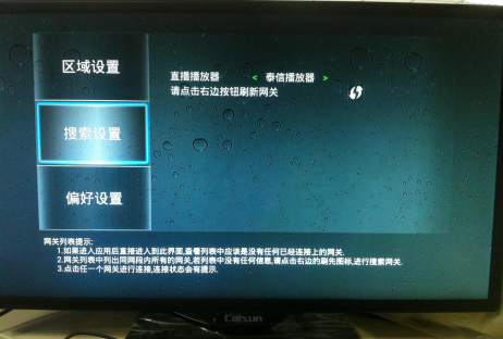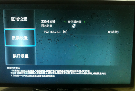 2、網絡盒子安裝DTV應用,會生成“數字電視”APK圖標,點擊進入如圖1所示的界面,在“搜素設置”界面點擊右邊按鈕刷新網關,即可出現如圖2所示的連接成功界面,然后點擊“返回”進入數字電視界面。