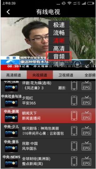 還有一點也很神奇,比如早上開車族想聽一下《朝聞天下》,那么就可以點擊音頻按鈕,實時廣播電視直播的內容,是不是很貼心?