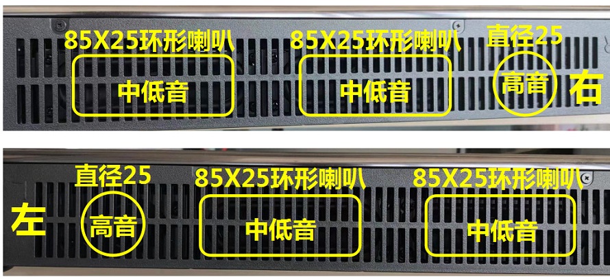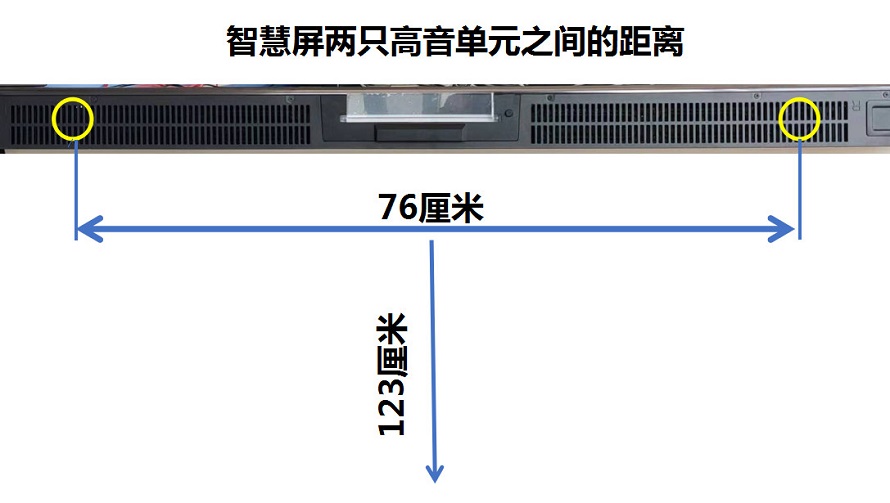 智慧屏的音箱采用了環形喇叭,紙質盆,喇叭邊是橡膠或泡沫的,高音是絲膜的,因為一體化的電視機拆卸困難,只在外部大體測量,喇叭數據見上圖,單位是毫米,音箱腔體容積廠家給的數據是1.6L。
