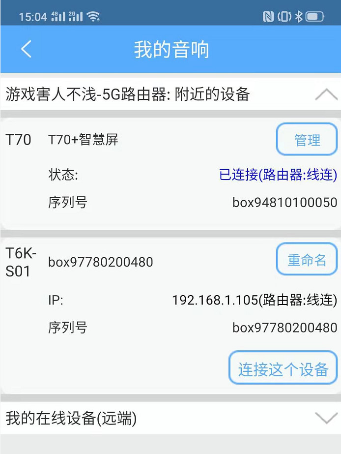 T70和手機連接相同的路由器,手機打開泰信智能家居APK,在”我的\我的設(shè)備”中,連接T70(我已將T70名稱改為“T70+智慧屏”)。