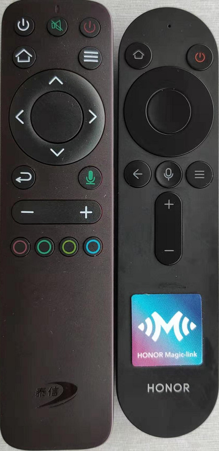T70的遙控器和智慧屏遙控器差不多大。T70遙控器也是一個學(xué)習(xí)型紅外線遙控器,整個外殼是深紫紅色半透明,用于透射紅外線,可見其成本是很高的。T70遙控器白色的電源開關(guān)鍵用于遙控電視機電源,紅色的用于T70電源遙控,還有4個多功能顏色鍵。藍色的是藍牙/電視切換鍵,按一下進入藍牙音箱,再按一下進入電視模式。 智慧屏的藍牙遙控器延續(xù)了互聯(lián)網(wǎng)電視簡潔的風(fēng)格。兩種藍牙語音識別率都比較高,操控比較順暢。