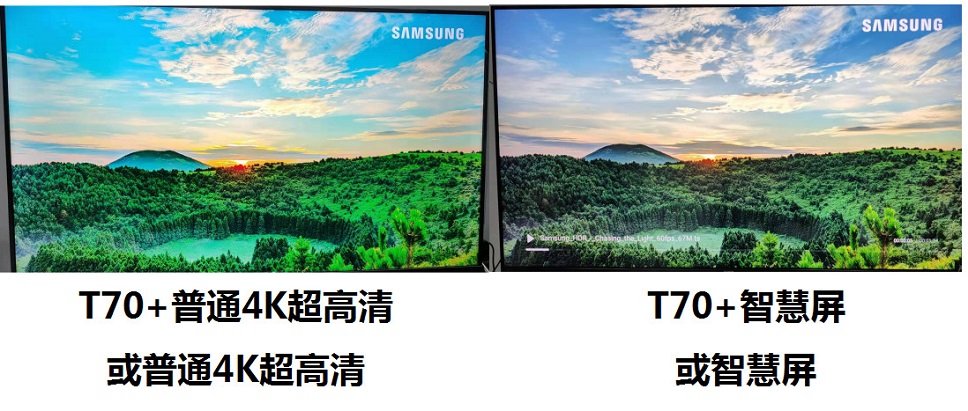 使用T70、普通4K超高清電視和智慧屏分別播放一段三星67Mbps的4K超高清視頻。這段視頻是HDR1000格式(專業(yè)、愛好者級別的HDR),10bit、H.265壓縮,是目前能找到的碼流速度最高的4K超高清信號源,在同一時刻手機拍照: