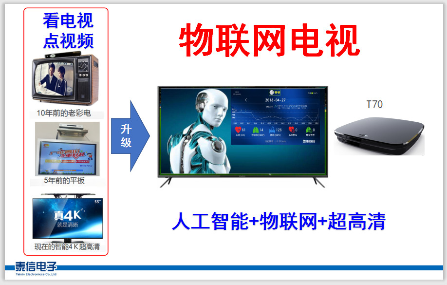 泰信物聯網電視主機與華為智慧屏都具備人工智能、物聯網、手機電視互動功能,標志著電視技術發展進入一個新階段。二者的不同點在于T70通過外接音箱提升音質,是主機、音箱完全獨立的分體電視,老電視機作為顯示器: