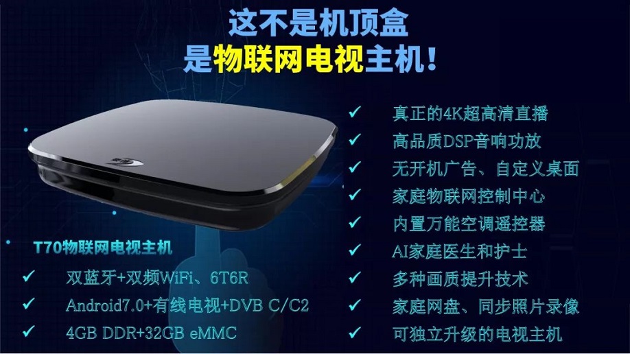 泰信率先推出了物聯網電視主機T70。隨后華為推出了針對增量電視升級的智慧屏