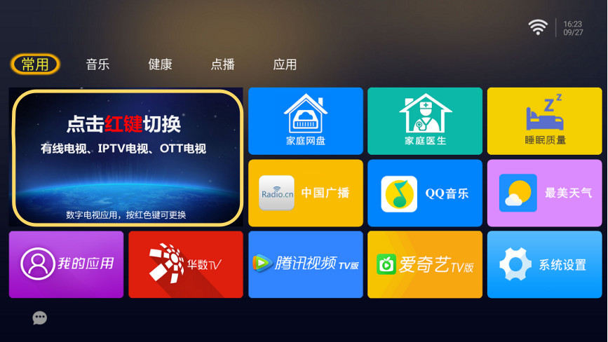 遇到這種情況,可以使用其它運營商的直播電視業務。具體方法是,下載好對應運營商的直播電視應用,在下面較大的窗口位置,按遙控器紅色建,選擇你想用的直播電視服務。