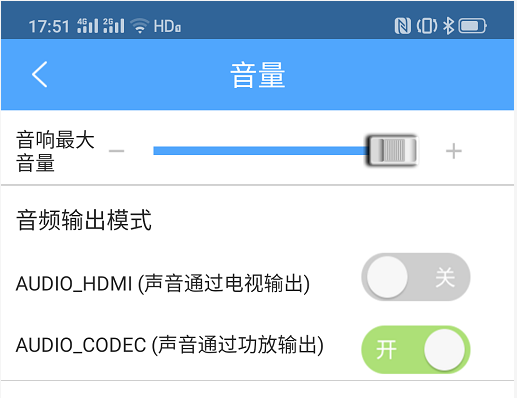 可以通過手機端,進入我的\設置\聲音設置,調高音響最大音量: