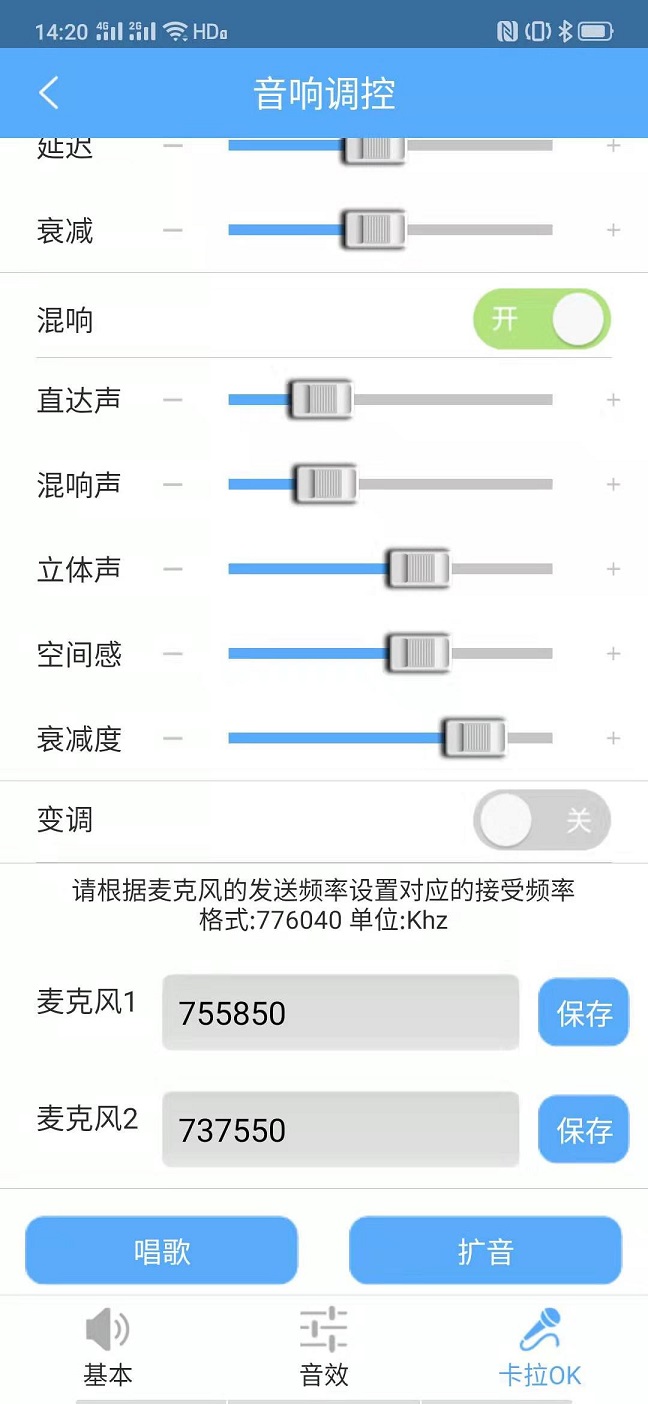T6K內置了數字U波段麥克風接收器,可以在手機上設置接收頻率。方法是進入“我的\音響調控\卡拉OK\控制頁面下拉菜單,就可以看到兩個麥克風接收頻率設置選項,只要其中一個頻率與你的麥克風頻率相同,就可以接受到麥克風聲音。