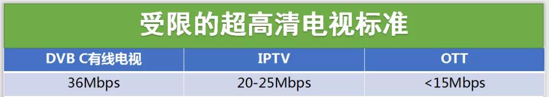 寬帶網(wǎng)絡(luò)誰(shuí)都可以用,在高峰期會(huì)擠占直播電視傳輸帶寬,卡頓中斷或延遲是家常便飯。超高清直播電視對(duì)網(wǎng)絡(luò)速度的要求就更高了,為了實(shí)現(xiàn)初級(jí)的超高清電視目標(biāo),實(shí)際的超高清傳輸帶寬又有些縮水: