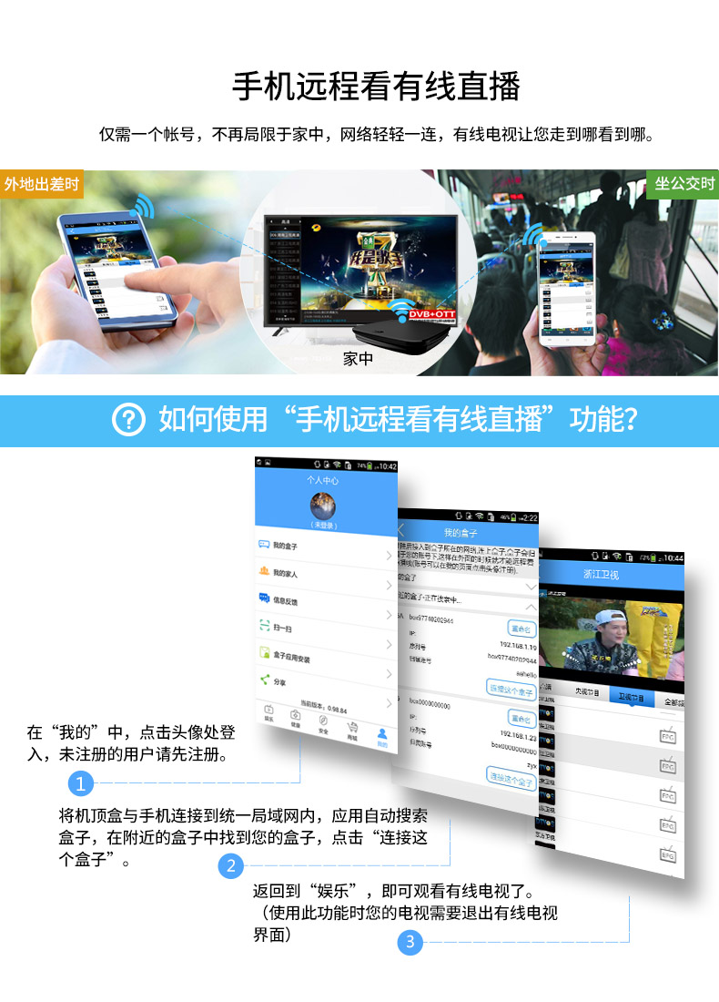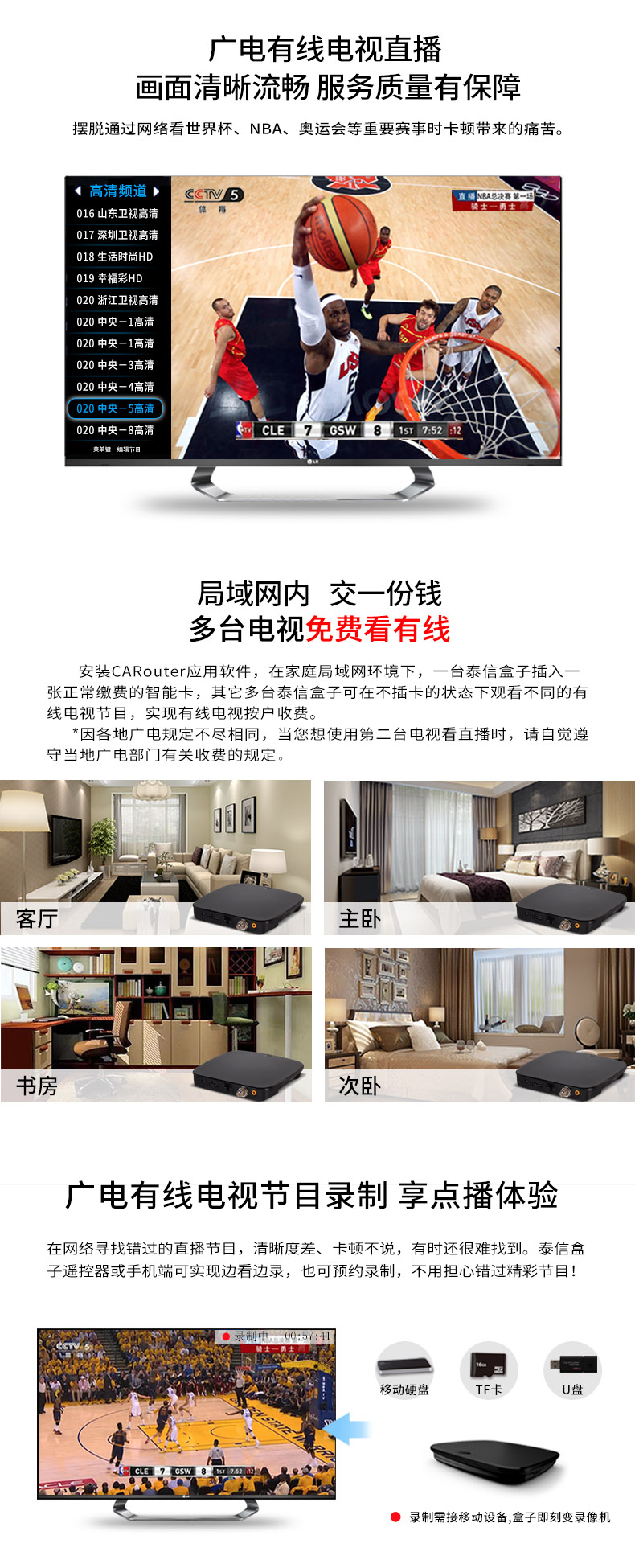每臺泰信盒子連接廣電有線信號,并連接到家中的寬帶網,將一張正常繳費的廣電智能卡插入其中一臺泰信盒子,其它的泰信盒子無需插卡就可以收看有線電視節目,且可獨立換臺,相互不受影響。