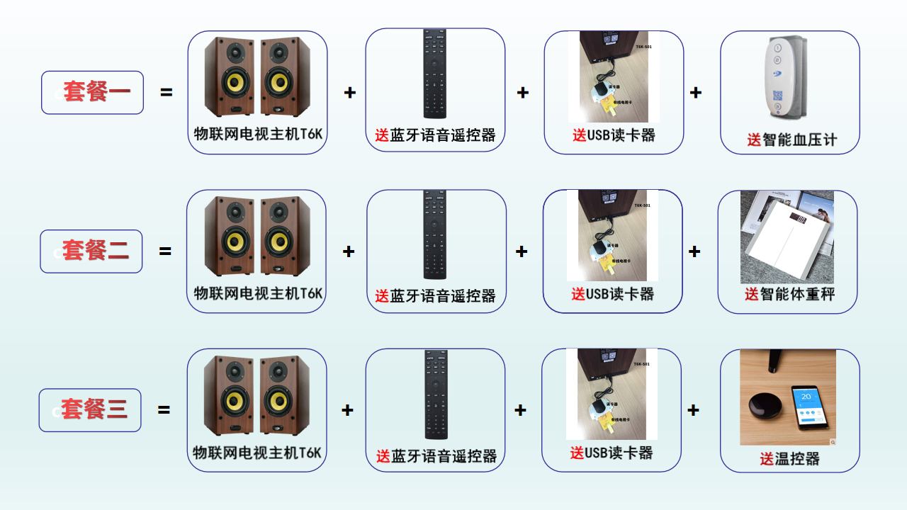 套餐一:送藍牙語音遙控器、USB讀卡器和智能血壓計這款血壓計是泰信自主研發的,一鍵測量、智能加壓,可以語音播報并查看歷史測量數據)!